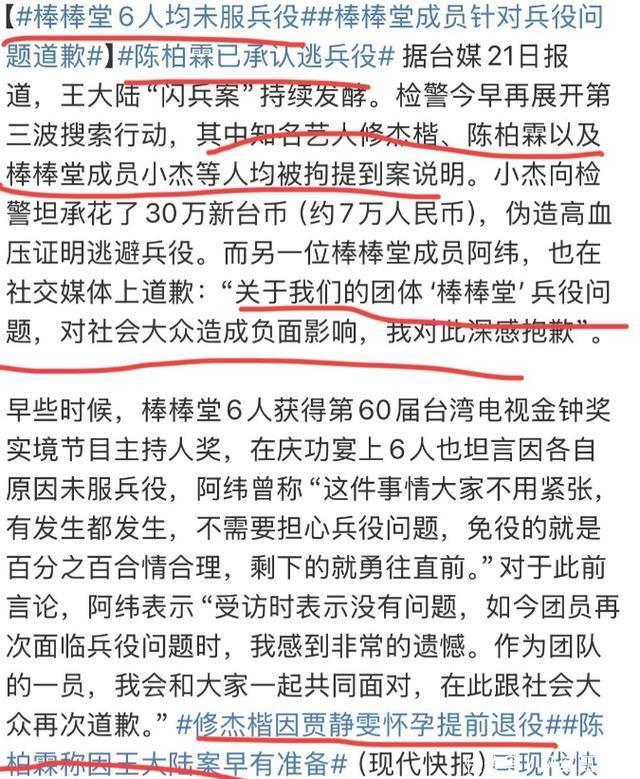 文丨编辑万史浮华 棒棒堂6人均未服兵役,不敢相信因为王大陆一个人,牵扯出这么多位未服兵役的男艺人。 台湾娱乐圈乱成一团,先是修杰楷陈柏霖因未服兵役被逮捕,紧接着棒棒堂6人也被逮捕,这个消息传开, 网友纷纷感叹不值得,看来这些人要彻底凉凉了 。